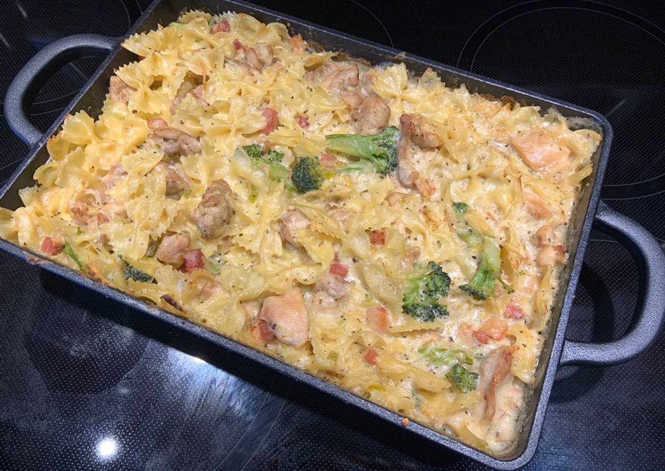 Casserole de farfalles gratinées au poulet, bacon et brocoli