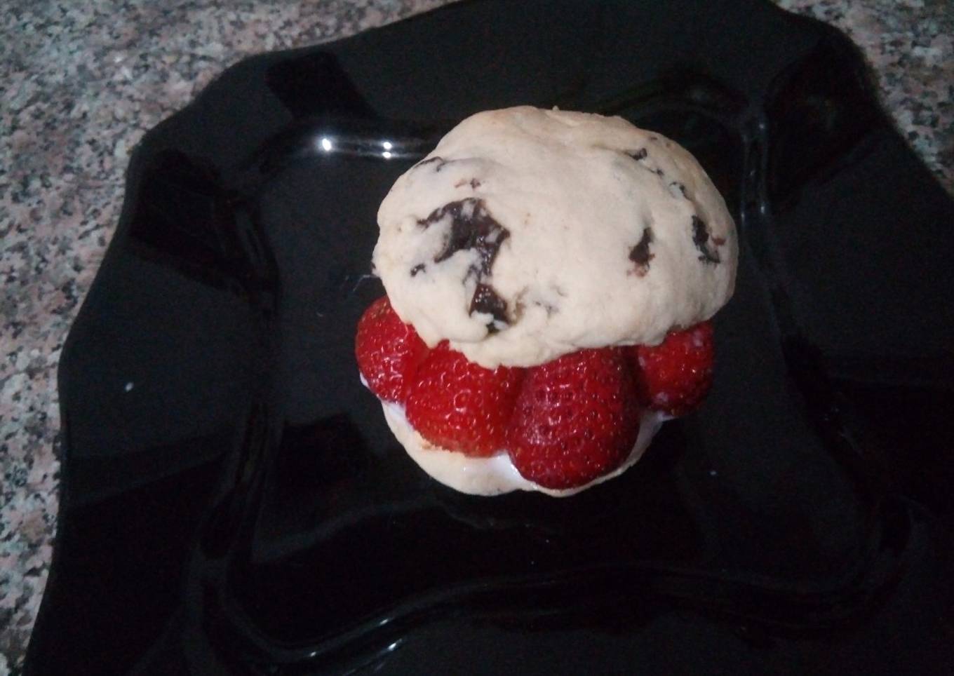 - Mettez la crème chantilly entre deux galettes et mettez les fraises coupés en deux. Bon appétit.
