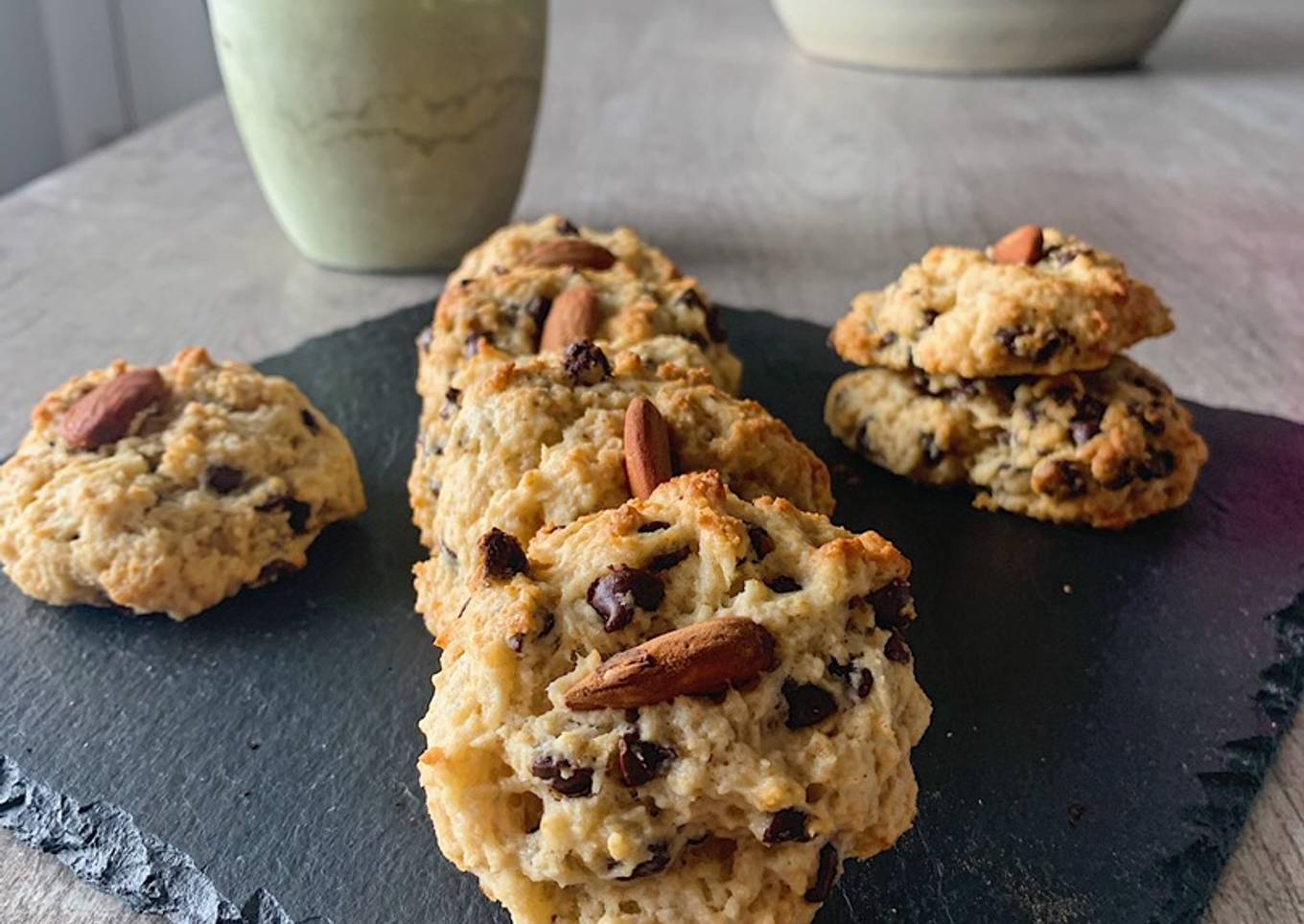 - Faire des petites "boules" de pâte, que vous aplatissez entre vos mains. Mettez les toppings.(pépites de chocolat, amandes, noisettes.....)